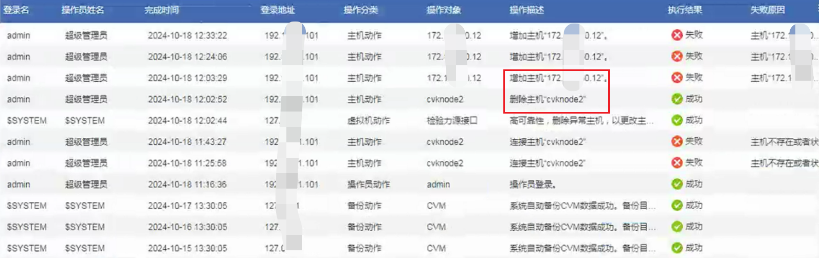 查看操作日志发现这台主机是原集群内的,先删除再加进来失败。