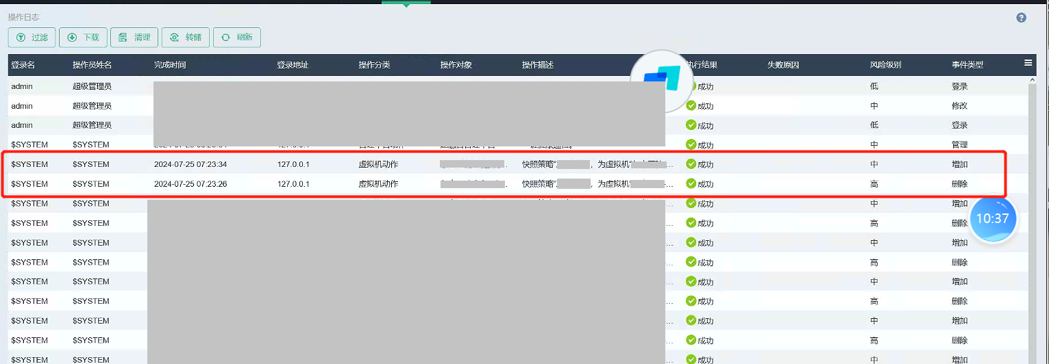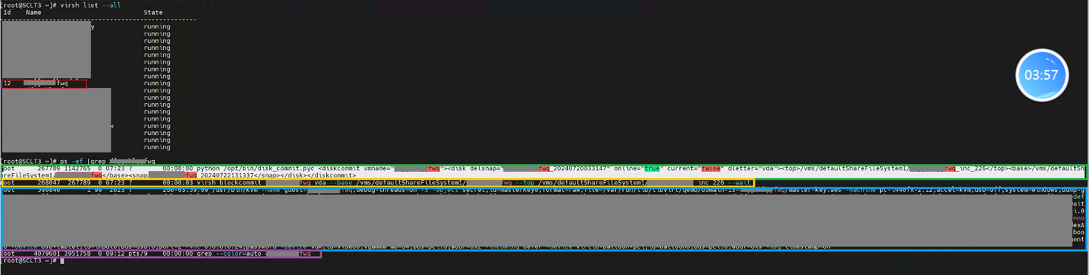 如图所示,查询出虚拟机共有4个进程,进程号267789为disk_commit任务(绿色),268047为blockcommit任务(黄色),蓝色为kvm进程也就是该虚拟机的进程,紫色是ps -ef动作对应的进程。如果虚拟机是运行状态且没有任何任务时,正常只会有后两个进程,而disk_commit和blockcommit均为快照过程中可能存在的进程,由此怀疑虽然前台任务台显示任务已成功,实际后台还有进程残留,该“残留”可能是后台任务还在进行,也有可能是真正的进程残留