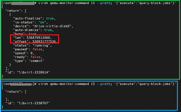 现场回显如下,绿色部分回显代表有外部快照任务在进行中,其中红框内的“len”和“offset”分别指“总合并大小”和“当前合并大小”,重复执行此命令可以看到“offset”在不断变化,因此确认该任务还在进行中,offset/len可以计算合并百分比,以此估算剩余时间。此问题查询时发现已经进行到98%左右,下方蓝色部分回显是无快照任务时的回显,也就是说外部快照进度已经真正完毕。