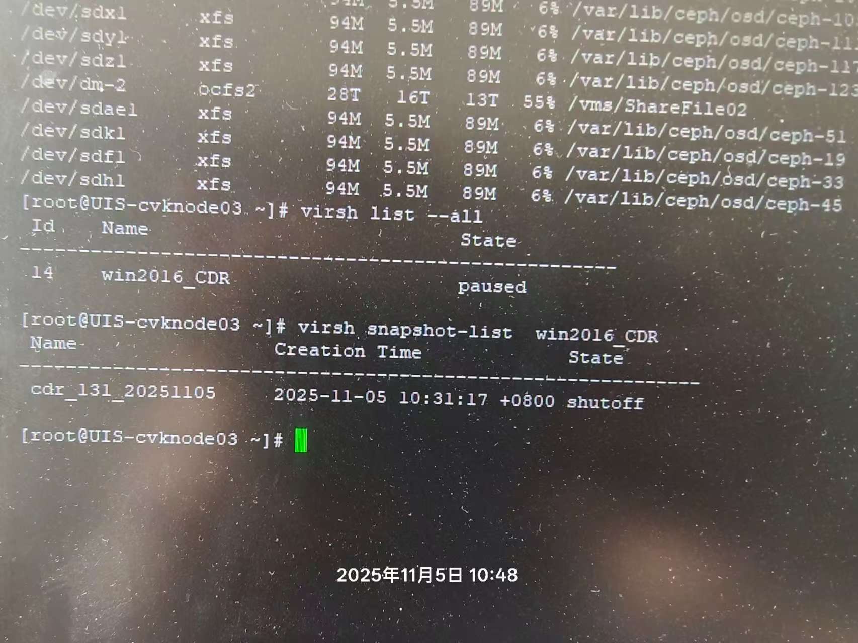 3、使用virsh qemu-monitor-command <虚拟机id> --pretty  '{ "execute": "query-block-jobs" }'命令(注意pretty后有空格)可以确认外部快照进程在后台还在进行、还是真正的进程残留,其中<虚拟机id>可以通过virsh list --all获得。