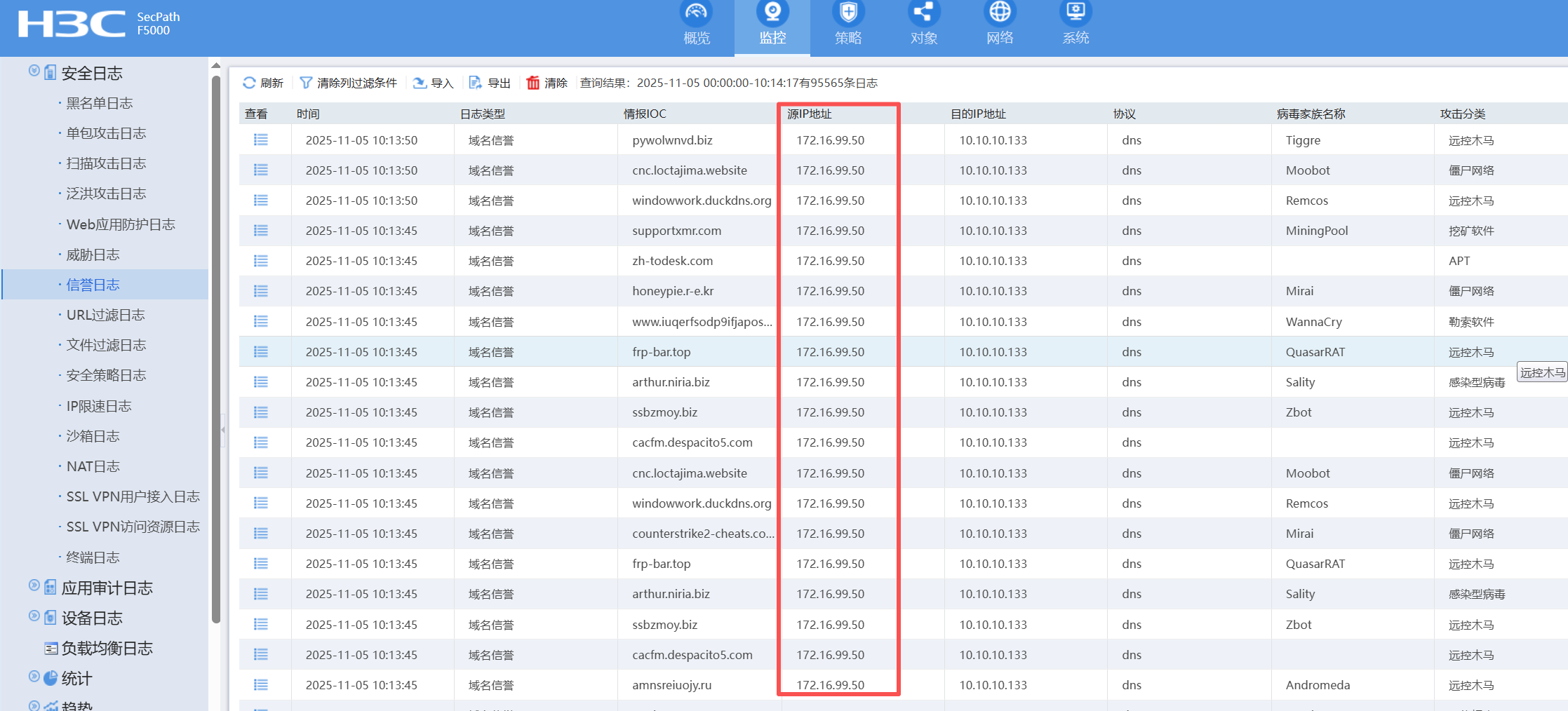 原因:当防火墙配置了 基于域名的地址对象组(如安全策略引用域名对象),防火墙会主动向DNS服务器发起域名解析请求(日志中表现为防火墙IP作为源地址)。若策略引用的域名被归为恶意域名(如态势感知系统判定),则解析行为可能被记录为“攻击”。