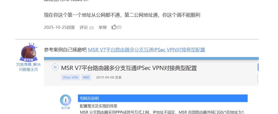 设备已经升级到2025年的最新版本(Version 7.1.064, Release 6749P30)为什么按照华三官网给出的说明书设置IPSEC仍然无法接通呢?使用配置命令也无法接通。这个问题困扰我二年多了,没有办法仍在使用L2TP。知了社区技术人员多次给出配置,有的命令根本就不存在,要不就是命令不全,至今为解决,也查过华三公司的IPSEC配置命令说明书,还使用了AI工具等也都无法联通。设备正常、网络正常,华三厂商的产品真坑啊。恳请哪位大神给出正确的配置方法。