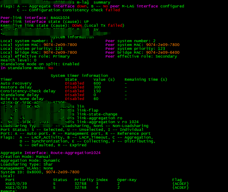 M-LAG 主备角色、系统 MAC、优先级等配置不一致会导致心跳逻辑异常: