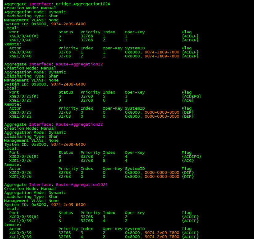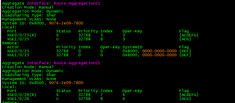 若聚合接口配置为Manual模式,需确保两端聚合组Loadsharing Type、Aggregation Mode完全一致。
