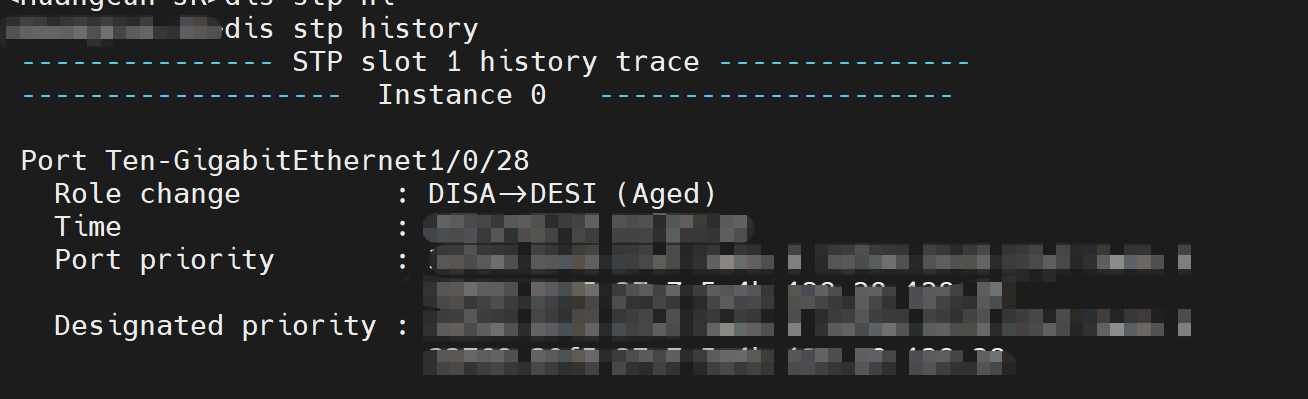 %Jan 17 03:44:42:386 2013 **** STP/4/STP_DISPUTE: Instance 0's port Ten-GigabitEthernet1/0/28 received an inferior BPDU from a designated port which is in forwarding or learning state. The designated bridge ID contained in the BPDU is ****, and the designated port ID contained in the BPDU is 128.52.