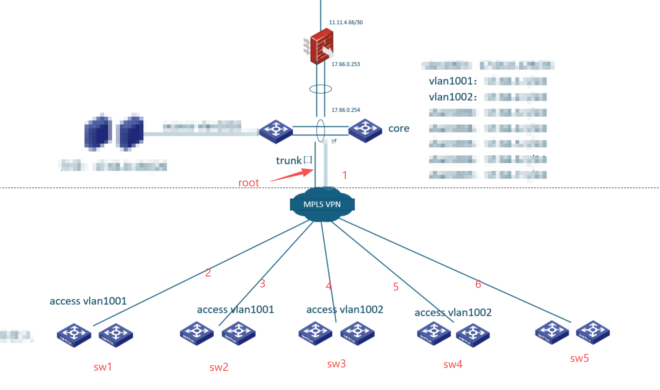 如图所示,sw1~sw5的端口都是access口对应vlan,网关都是core上,1口是根桥,4口被堵塞了,如何解决