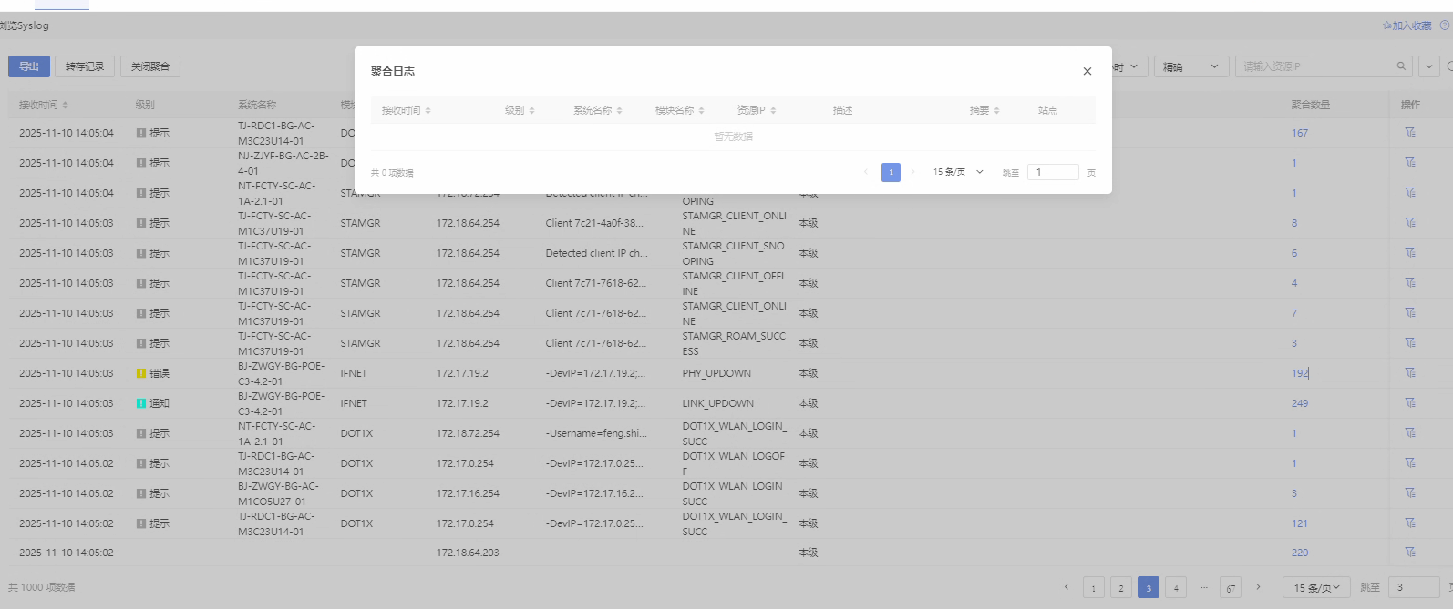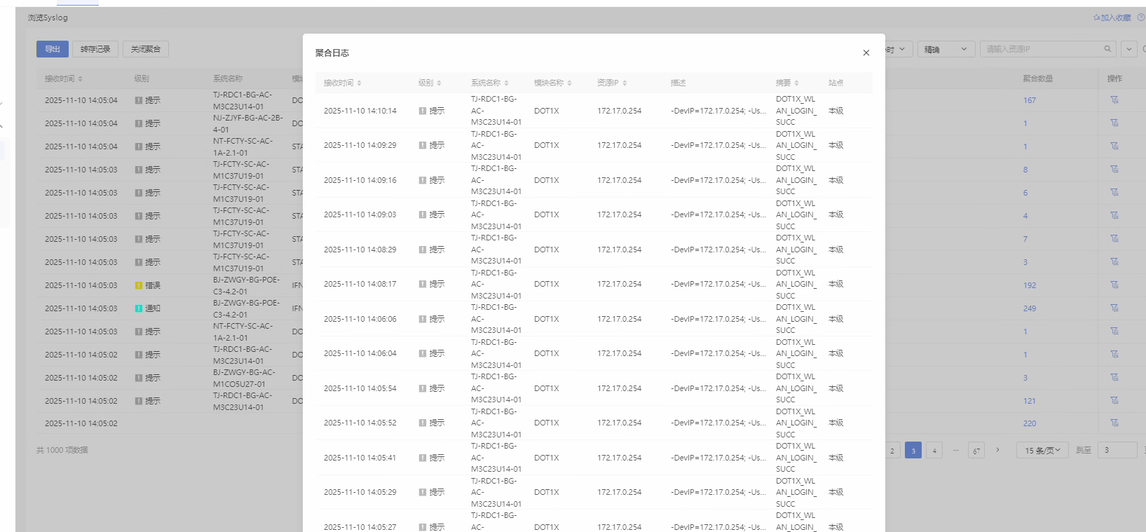 - 第二张图中聚合的DOT1X 模块(802.1X 认证) 有持续的日志生成,因此显示条目。