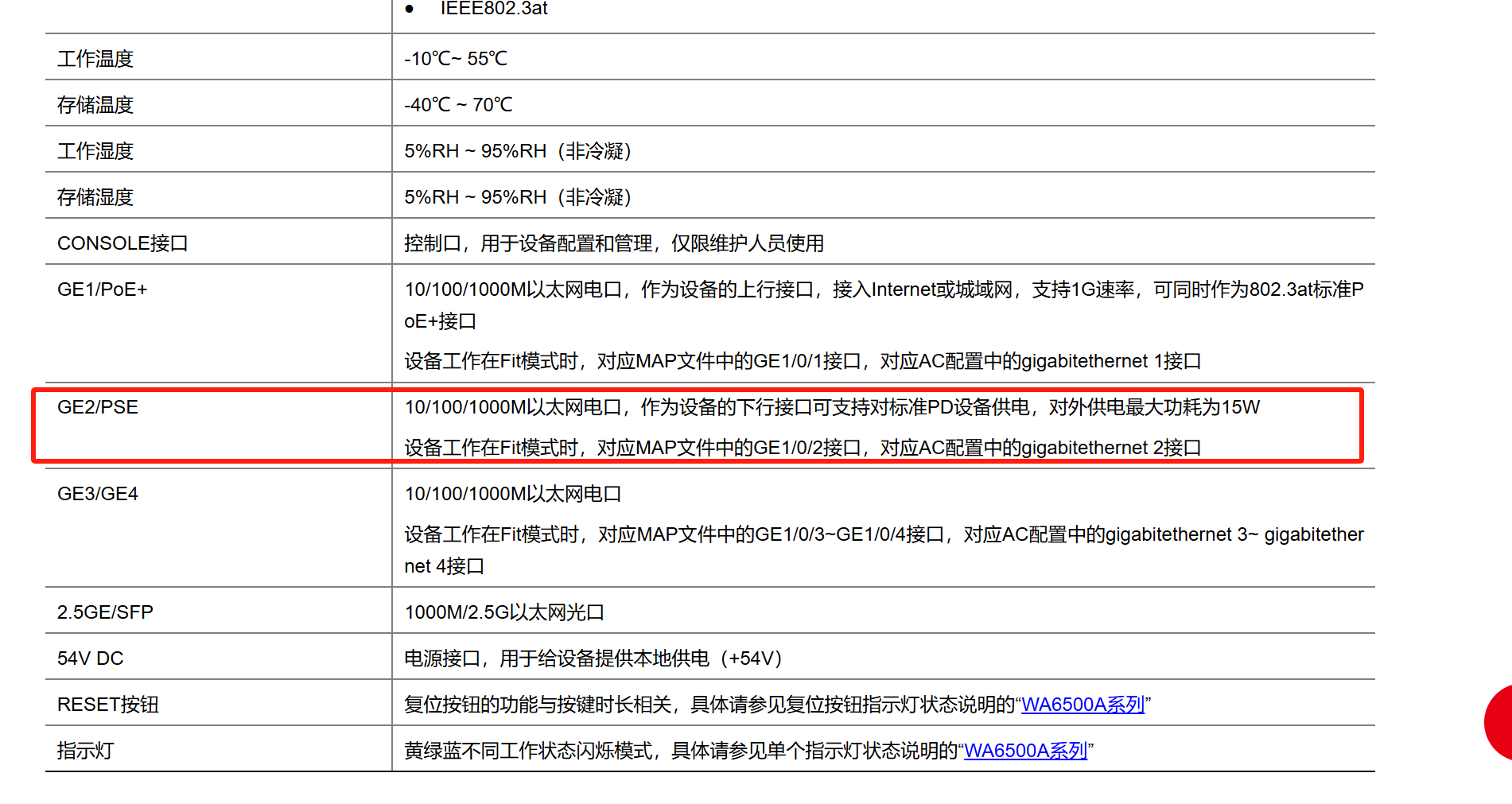 供电标准:GE2/PSE 口支持802.3at(PoE+),最大输出功率为30W(需 AP 电源功率足够)。