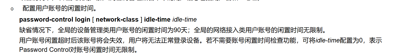 关闭闲置功能后,账户不会再因长期未登录被禁用,若需保留闲置策略但延长时间,可配置idle-timeout 180(单位天,按需调整),而非直接关闭。