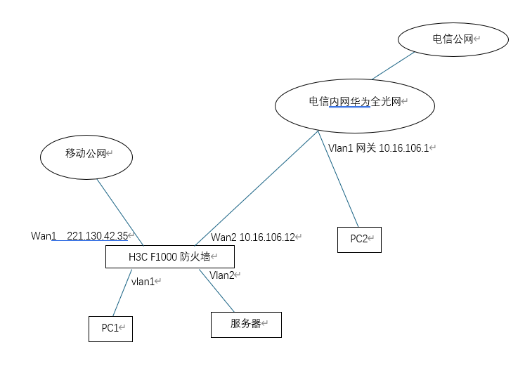 防火墙wan1和wan2已经做了NAT、端口映射,缺省路由走wan1,访问10网段走wan2,pc2访问服务器正常。