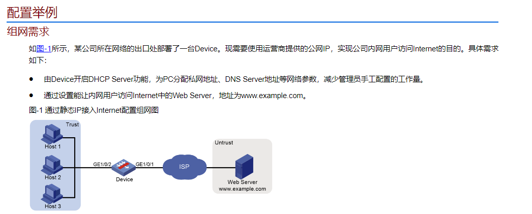 原理:HOST1 发往 Internet 的流量会直接发给 Device,Device 通过 NAT 将私网地址转换为公网地址,再经 GE1/0/1 接口转发到 ISP,最终访问 Web Server。