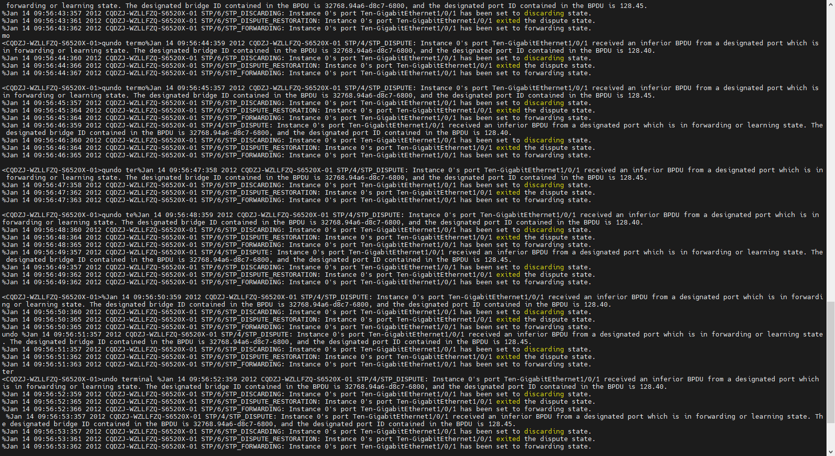%Jan 14 09:56:50:359 2012 CQDZJ-WZLLFZQ-S6520X-01 STP/4/STP_DISPUTE: Instance 0's port Ten-GigabitEthernet1/0/1 received an inferior BPDU from a designated port which is in forwarding or learning state. The designated bridge ID contained in the BPDU is 32768.94a6-d8c7-6800, and the designated port ID contained in the BPDU is 128.40.
