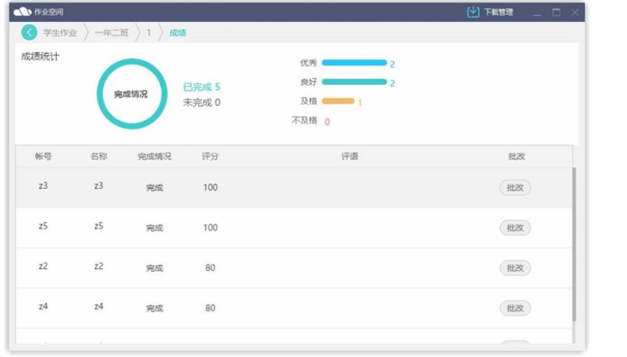 教师可以查看学生作业完成情况和批改情况,下载保存本次学生作业,或删除本次作业任务