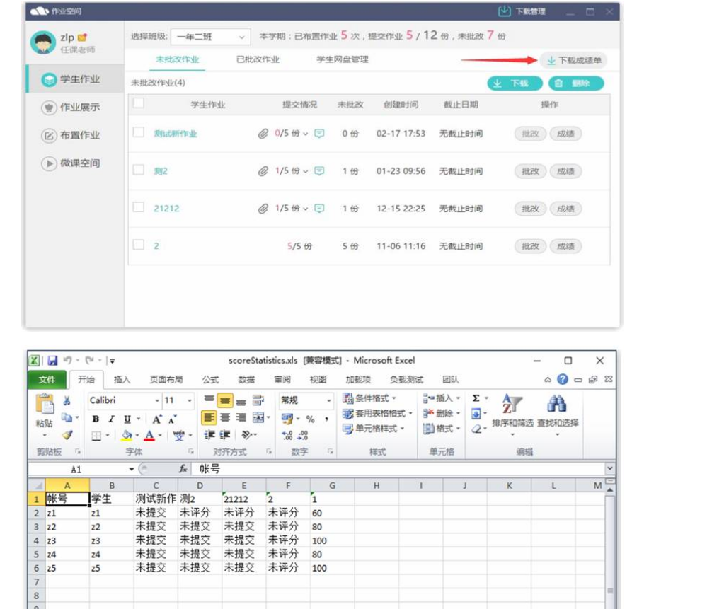 进入首页,点击[下载学生成绩单] ,即可下载 excel 成绩统计表到本地。成绩表每个 sheet 表为一个班 级的作业,包含了该班级的所有作业评分情况