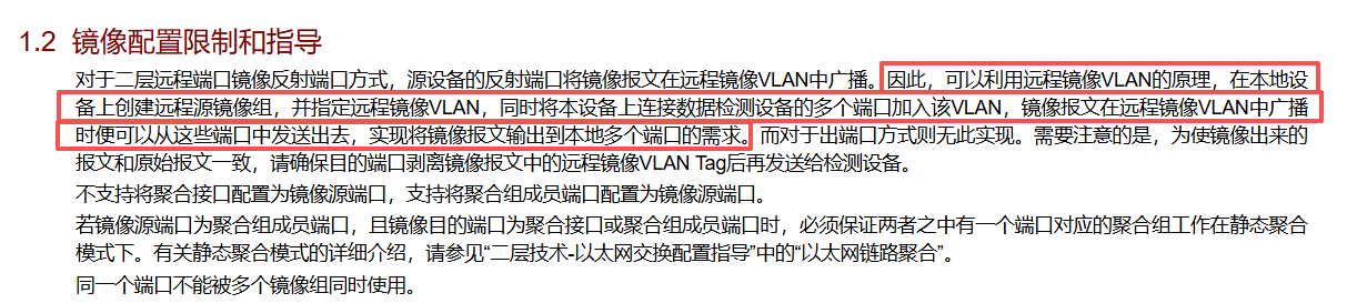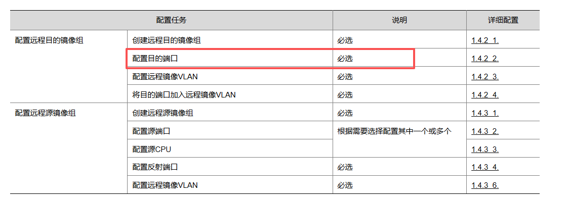 关于我想要在远端交换机上实现将镜像报文输出到多个端口的配置,资料上要求必须先添加目的端口,再将目的端口加入到镜像vlan。如下图所示