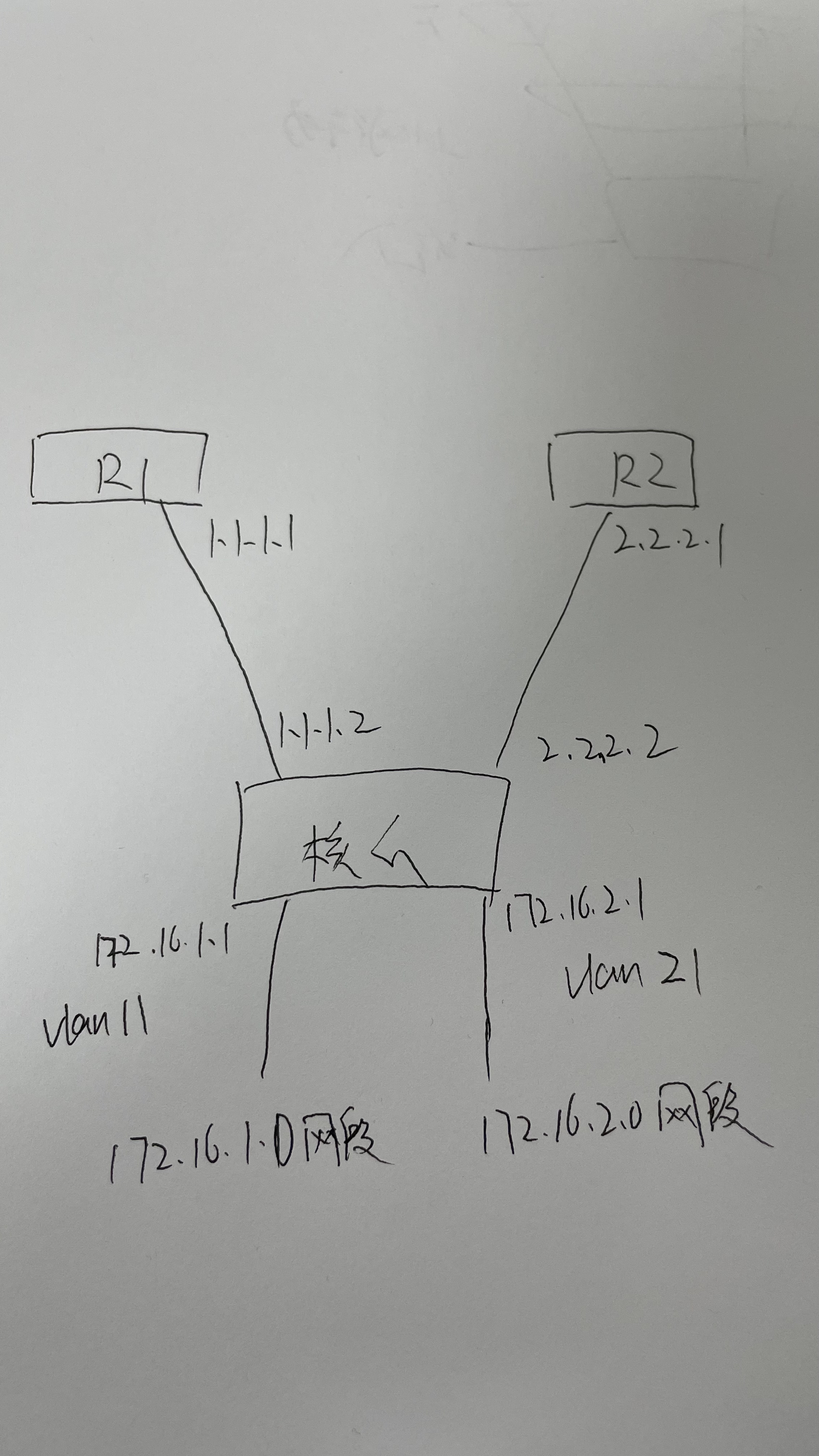 两台路由器R1和R2,一台核心交换机,两个内网地址段,172.16.1.0网段属于vlan 11和172.16.2.0网段属于vlan 21,核心交换机配置一条默认路由ip route-static 0.0.0.0 0.0.0.0 1.1.1.1,另外想让172.16.2.8地址走2.2.2.1上网,目前策略路由配置之后,172.16.2.8走2.2.2.1出去了,但是172.16.1.0网段在内网无法访问172.16.2.8