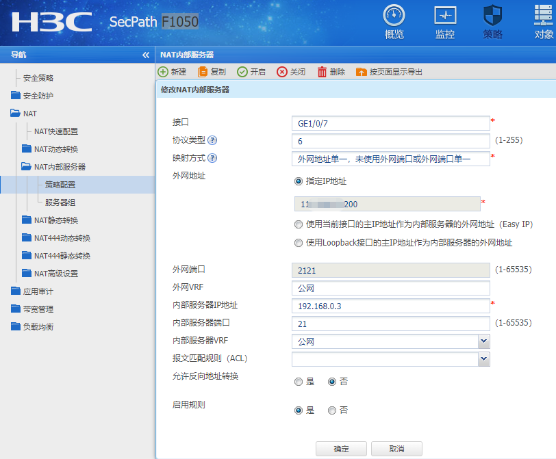 从目前生效的NAT策略中复制了一条,只改了一下外网端口和对应的内网IP和端口,却没生效,是什么原因?需要怎么调整?