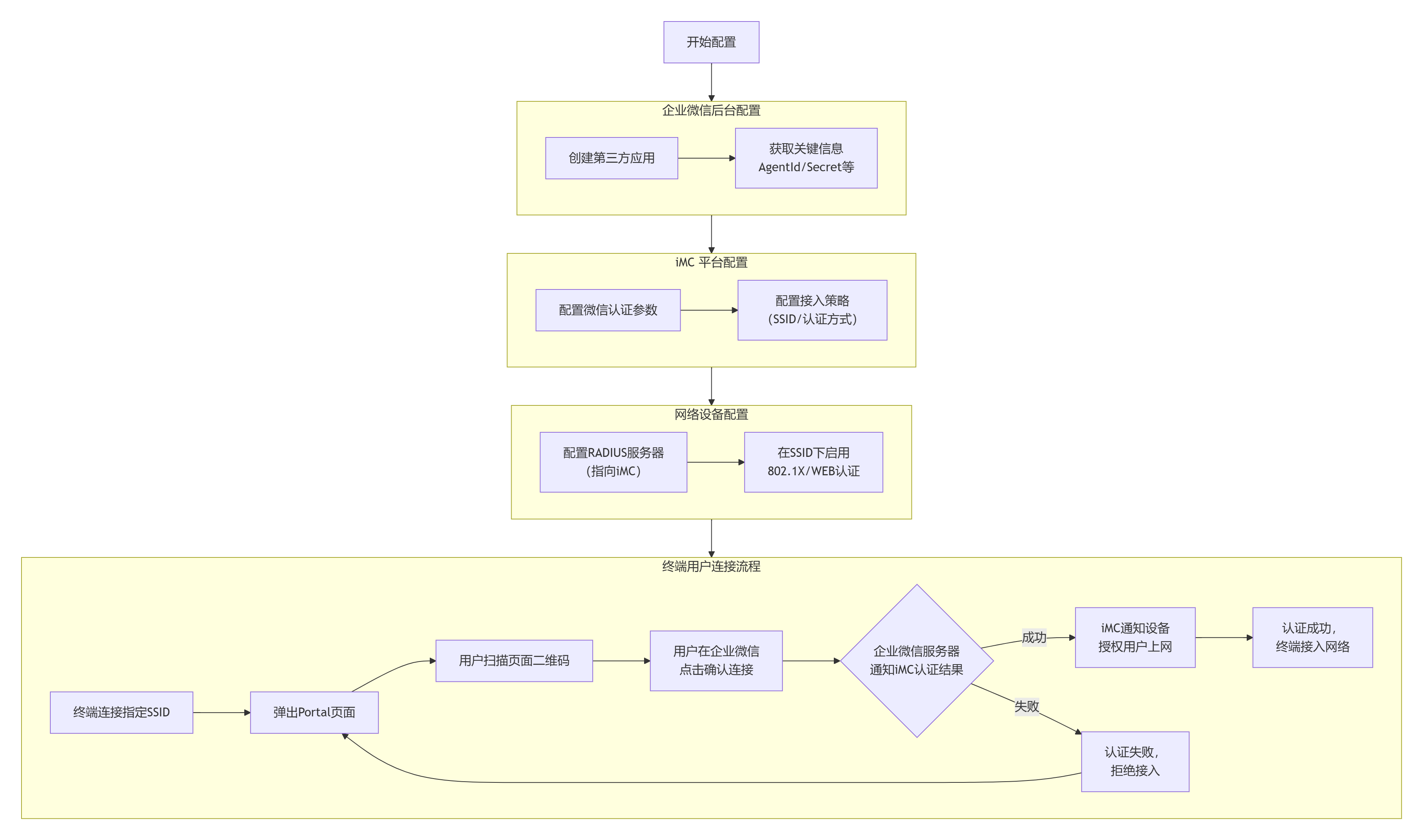 整个配置流程涉及企业微信后台、iMC平台和网络设备三方的配合,可以参考下图所示的协作关系与核心步骤: