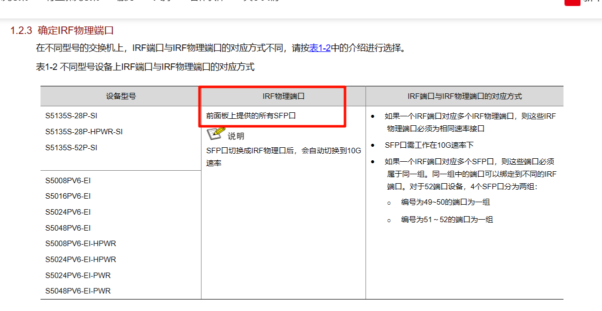 在不同型号的交换机上,IRF端口与IRF物理端口的对应方式不同,请按表1-2中的介绍进行选择。