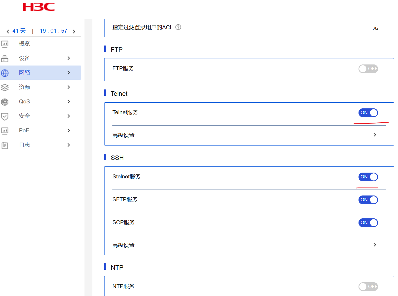 交换机在车间,需要梯子才能上去,不想到现场,所以寻求下帮助。我在WEB端已经把SSH和TELNET功能开起来了,也给了管理员服务的权限。但是SSH输了密码之后,就自动断开。telnet也不行 WEB界面上能看到的我都设置了,好像没其它地方可设置了。