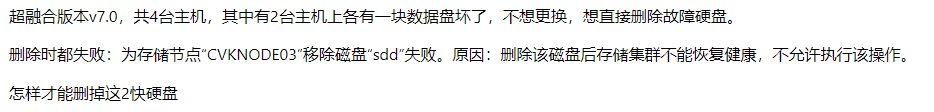 按你图片里,点击确定,但是任务失败,报:为存储节点“CVKNODE03”移除磁盘“sdd”失败。原因:删除该磁盘后存储集群不能恢复健康,不允许执行该操作。