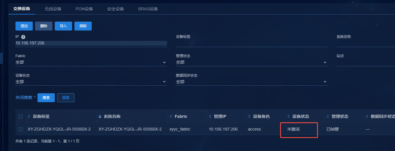 在控制器界面上,系统名称为 XY-ZGHDZX-YQGL-JR-S5560X-2、管理IP为 10.156.197.206的接入交换机,其 “设备状态”为“未激活”。