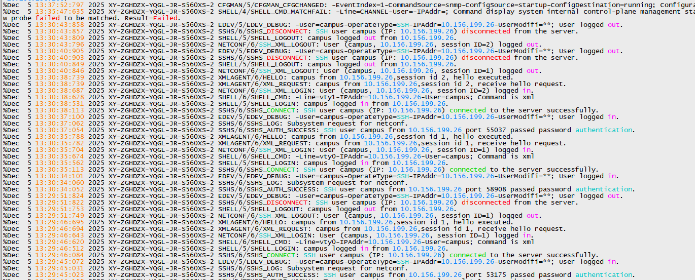分析:虽然您的SSH手动测试是成功的,但控制器的NETCONF连接尝试可能更频繁,或者在特定交互环节(如NETCONF能力集协商、配置数据模型验证时)触发了问题。CFGFILE_NOT_MATCH是一个非常关键的线索,强烈暗示交换机上为控制器开放NETCONF功能所需的特定配置可能存在错误或缺失。