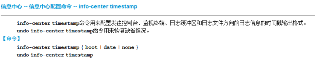 info-center timestamp命令用来设置发往除日志主机方向外的其它方向的系统信息的时间戳输出格式。undo info-center timestamp命令用来恢复缺省情况。