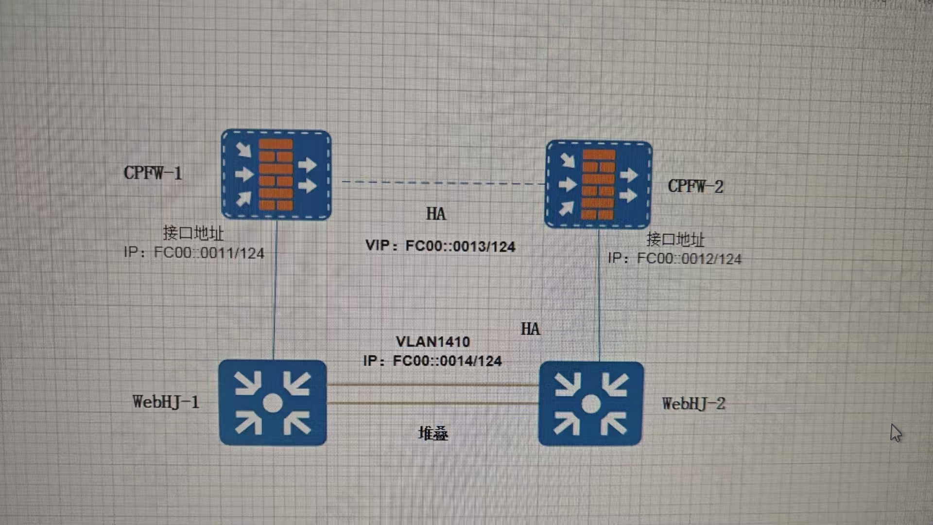 1、两台CheckPoint防火墙配置HA,主机是CPFW-1,备机是CPFW-2,它们的接口本地IPV6地址和VIP IPV6浮动地址,如上图;