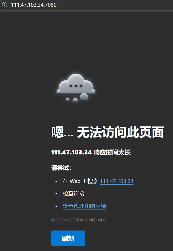 如果是公网去通过公网的地址和端口访问不行的话,那检查下配置,现在内网通过内网ip和端口看能不能访问服务器;在换外网的端口试一下,楼上说的那几个端口是需要备案的 如果没备案需要规避;尝试用10000往上的端口;