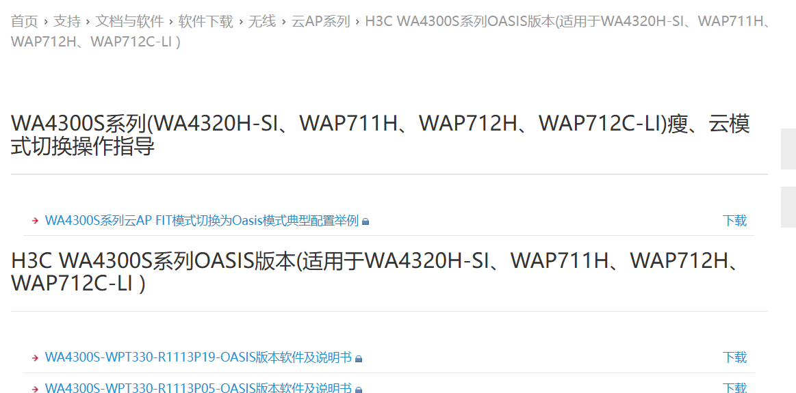 首页支持文档与软件软件下载无线云AP系列H3C WA4300S系列OASIS版本(适用于WA4320H-SI、WAP711H、WAP712H、WAP712C-LI )