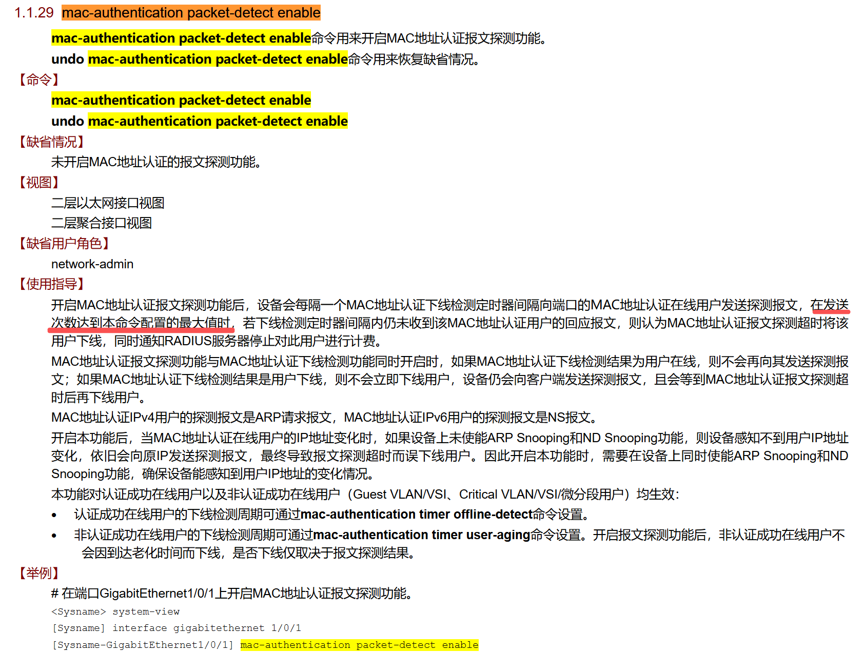 这个mac-authentication timer offline-detect下线检测定时器默认300s已知,但是这个”发送次数达到本命令配置的最大值“ 是多少次呢,手册未具体说明,有知道的大佬可以指教一下吗?