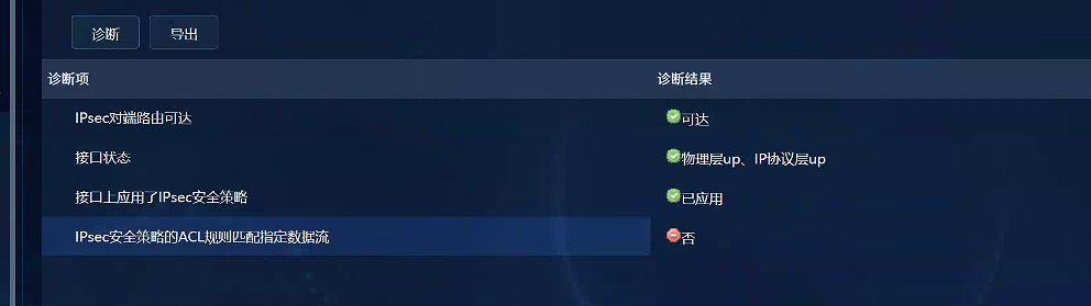 我现在有一台F5000的设备,配置好了ipsec,使用的是国密主模式,但是配置好了,发现vpn起不来,在系统-诊断-ipsec诊断里面输入源,目的地址,提示acl数据流匹配有问题,请问这是为什么,还是这个国密主模式有什么需要配置才能通