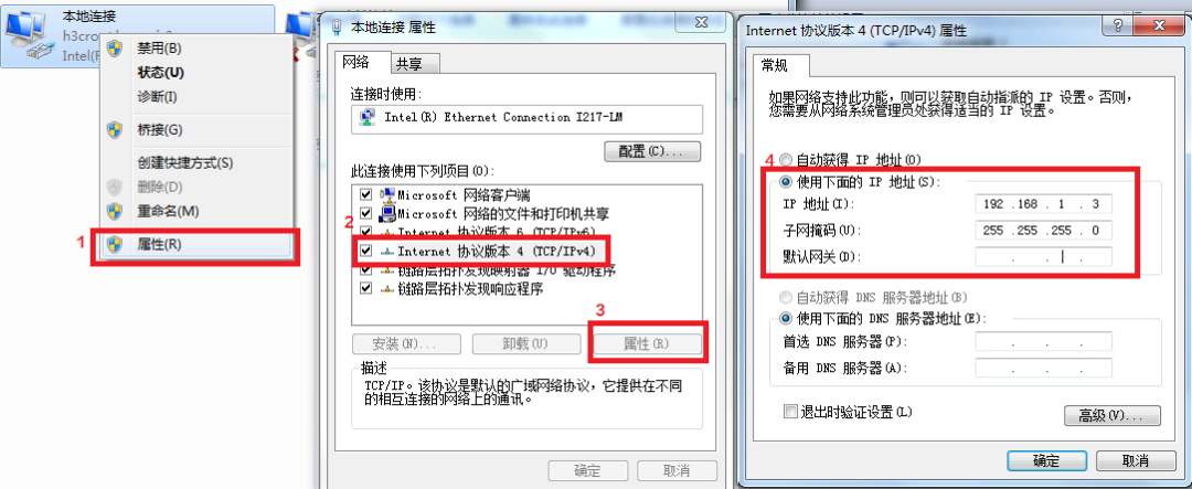 Win7系统:依次打开 “控制面板”—“网络共享中心”—“更改适配器设置”—右击“本地连接”—“属性”,打开如下对话框,选择Internet 协议版本4(TCP/IPv4),点击“使用下面的IP地址”,手工配置与设备管理IP同网段IP(即前三组数字相同,最后一组数字不同的IP地址),如下所示: