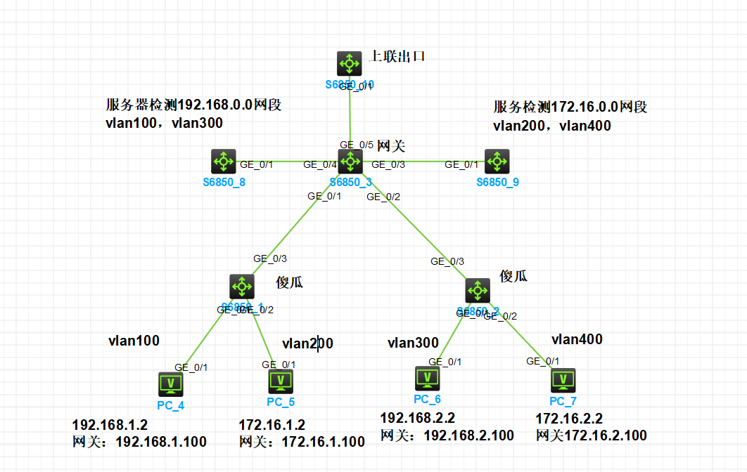 拓扑如下图所示,这样基于ip的vlan划分可以实现吗,我现在模拟上配置ping不通服务器端。核心接口大致配置如下