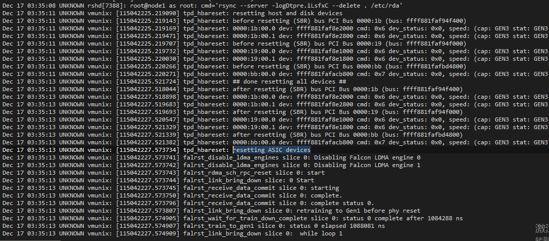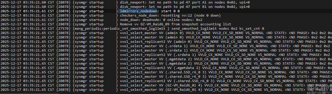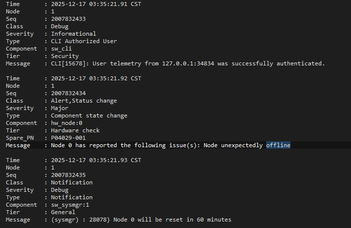 Node unexpectedly offline(节点意外离线),且出现了 resetting ASIC devices(复位 ASIC 硬件设备)、BBIU test Off: PCBWO uC, Wr Hw Err(硬件接口单元 BBIU 测试失败,提示硬件写入错误)等硬件级别的故障 / 复位操作。sysmgr(系统管理进程)执行的Node will be reset、vvol_select_master等操作,属于软件层面的故障恢复 / 状态同步,是硬件异常后的 “被动处理”,并非问题根源。