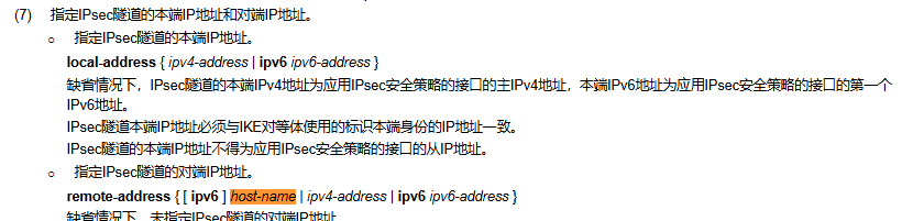 hostname:IPsec隧道的对端主机名,为1~253个字符的字符串,不区分大小写。该主机名可被DNS服务器解析为IP地址。