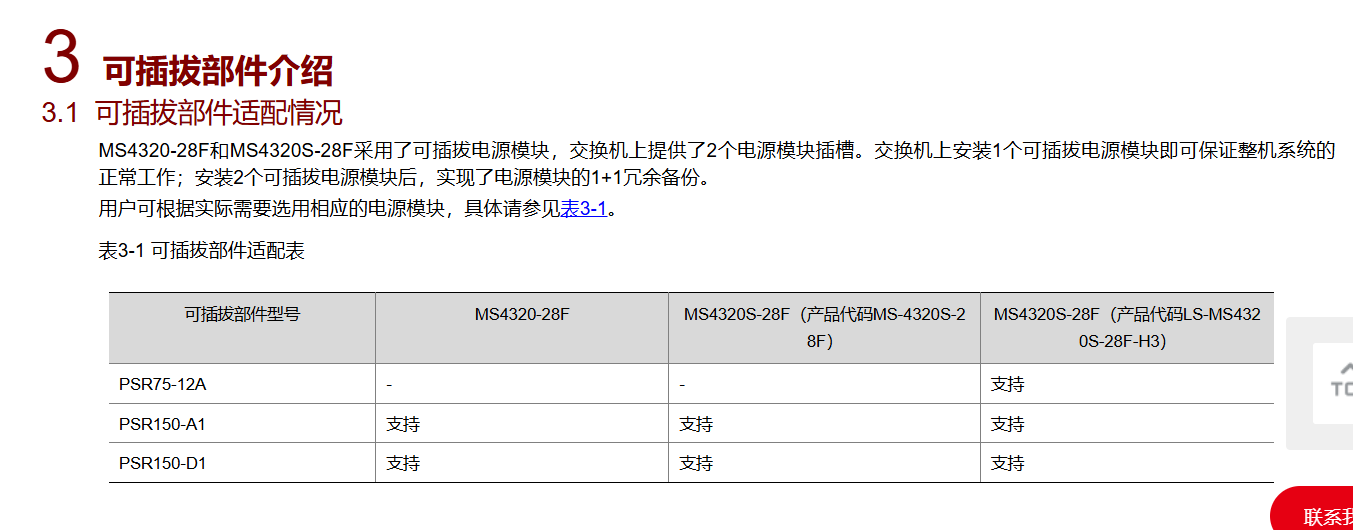 交换机型号为MS4320-28F,查询官网资料适配电源型号为PSR150-A1。