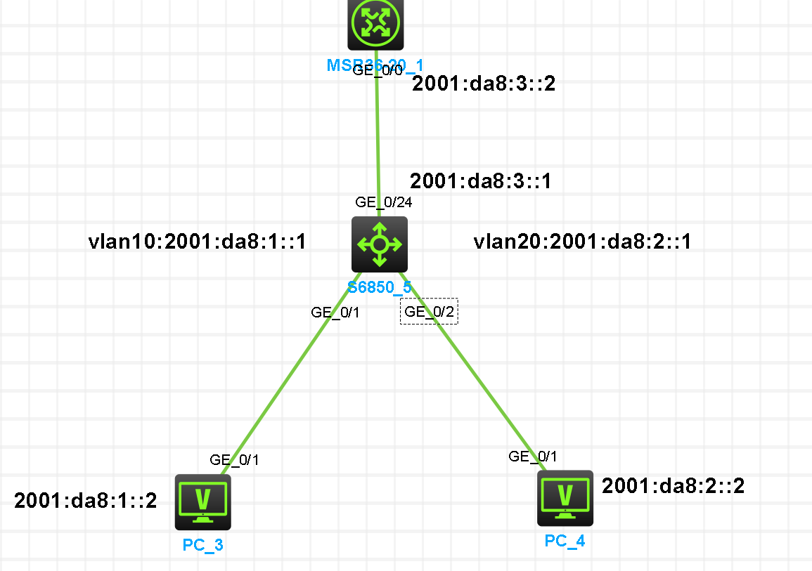 组网描述:路由器R1的g0/0口连接三层交换机sw1的g1/0/24口,三层交换机的g1/0/1和g1/0/2分别连接pc,pc1地址:2001:da8:1::2/64,pc2地址:2001:da8:2::2/64,分别属于vlan10和vlan20.