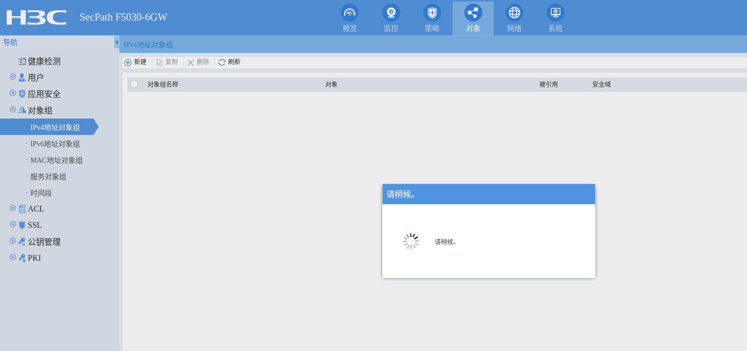 两台F5030-6GW堆叠使用,Web登陆后发现策略页面一直空白不显示已配置的策略条目(以配置60条),对象页面点击ipV4对象组后一直显示请稍后。求助该怎么解决!!!
