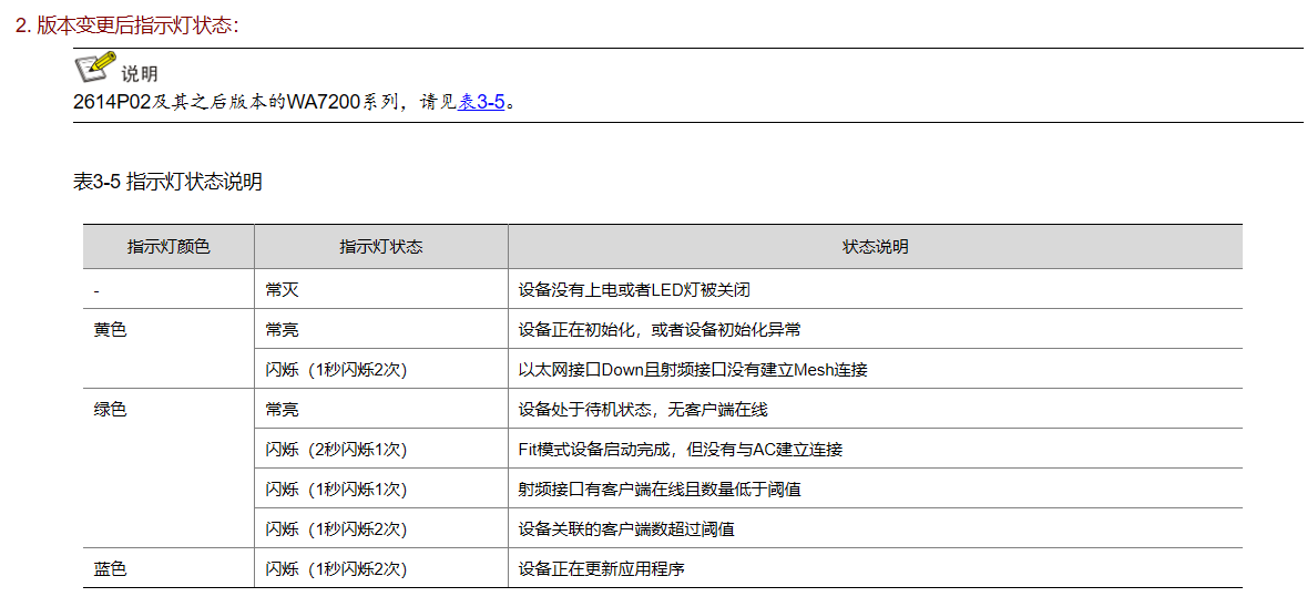 但根据最新WA7200系列指示灯说明,绿灯闪烁(2秒闪烁1次)在Fit模式下定义为“设备启动完成,但未与AC建立连接”,此定义不适用于Anchor-AC模式。不同工作模式下指示灯含义不同,需参考对应模式的说明。