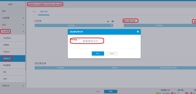 点击web页面正中间下方的网络菜单,进入“ 无线配置>无线安全>黑白名单 ”点击黑名名单旁边的+号进行添加黑名单