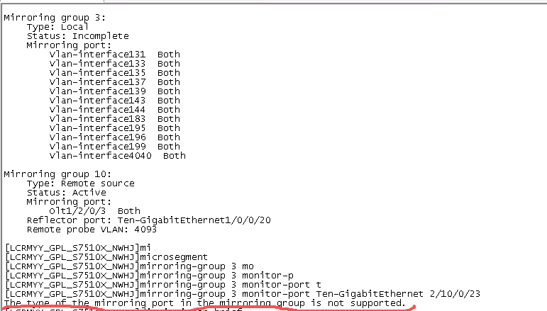 镜像端口配置的源镜像端口全是vlan接口,目的镜像端口是物理接口报以下错误The type of the mirroring port in the mirroring group is not supported.