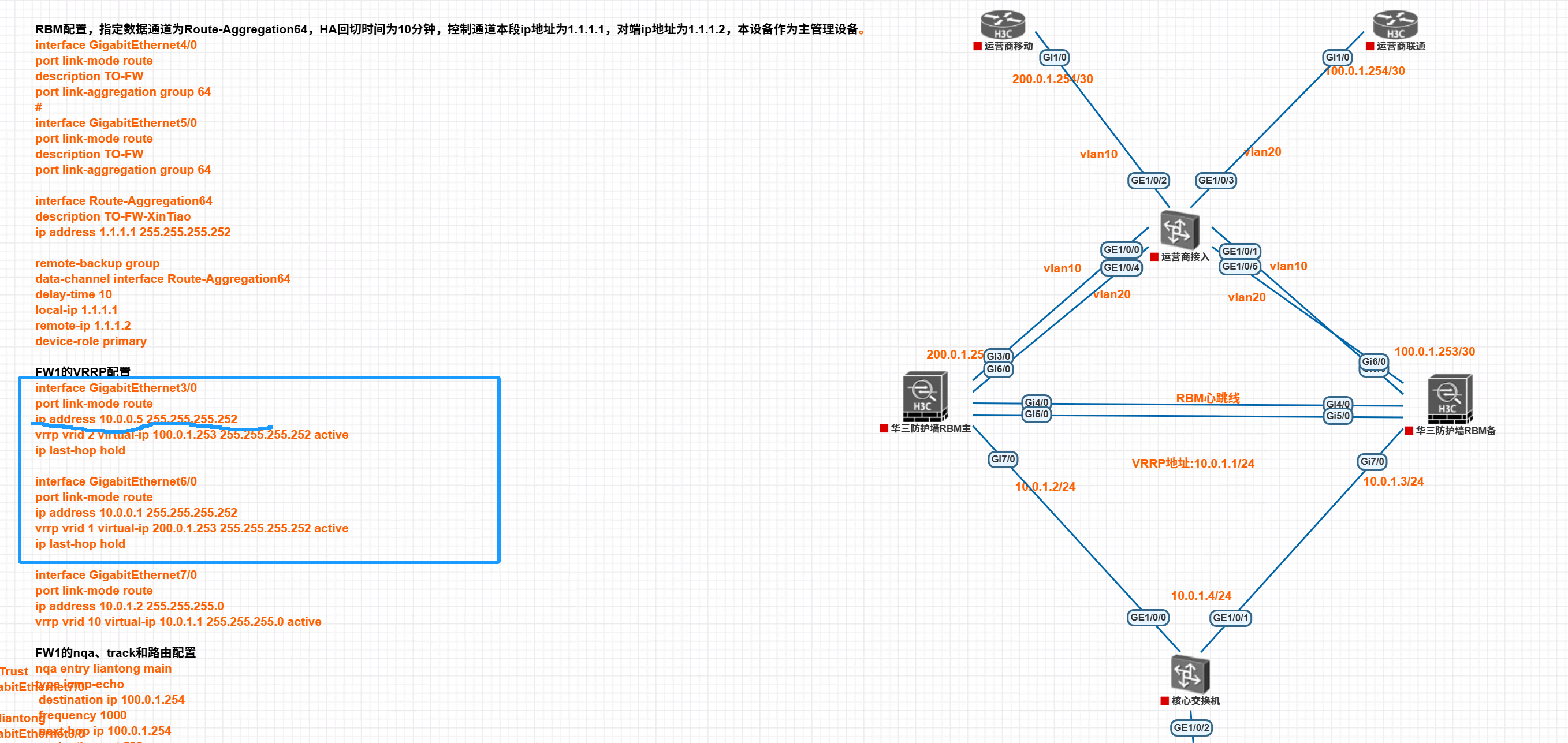 RBM主备模式 + 动态路由协议 + Track接口监控实现主备切换。