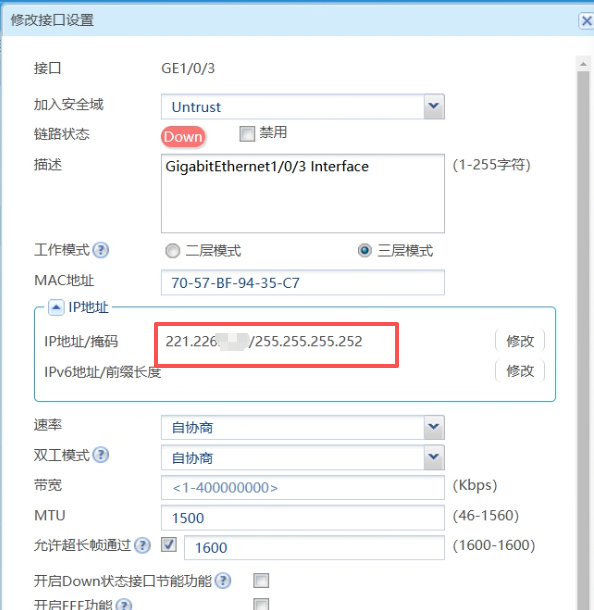 请问各位大佬,F100防火墙,在3口原来是电信的宽带,把固定的IP换为移动的固定IP,另外添加了新的静态路由,DNS都添加了,其他任何配置没有动的情况下,不能ping外网网关,不能上网是漏了哪里没设置吗?查看路由发现是有新添加的静态路由的,其他配置都没改