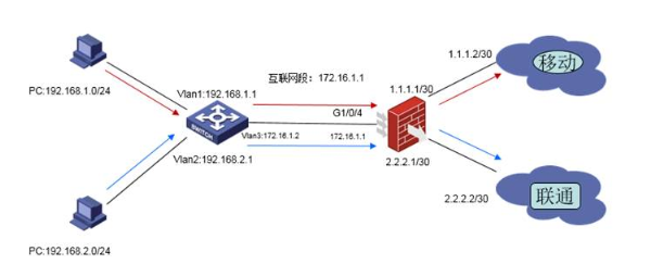 防火墙作为网络出口设备,外网有移动和联通两条线路。内网有192.168.1.0192.168.2.0两个网段,需要实现192.168.1.0网段走移动线路,192.168.2.0网段走联通线路。当两条线路中的一条线路故障时数据可以通过正常链路转发。