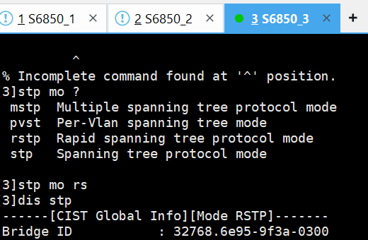 但是看你的评论,你应该是要不通的vlan走不同的链路,这样你就要配置多实例,而不是改rstp然后只配置实例0