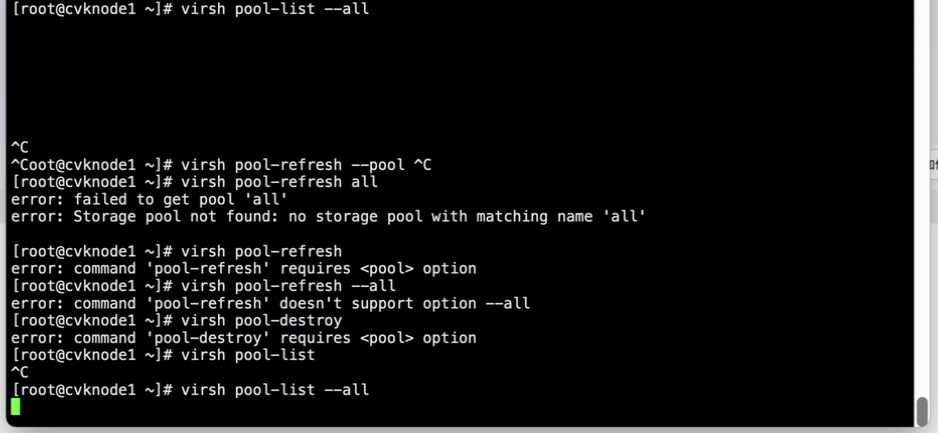 断电重启集群,在后台使用virsh pool-list --all,可以查看到有新建测试存储池,尝试使用virsh pool-undefine该存储池,执行后卡住,同时virsh所有相关操作都卡死无法执行。