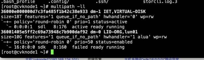 使用命令 multipath -ll 检查多路径状态,确认路径 sdk(16:0:0:0) 是否异常或丢失。