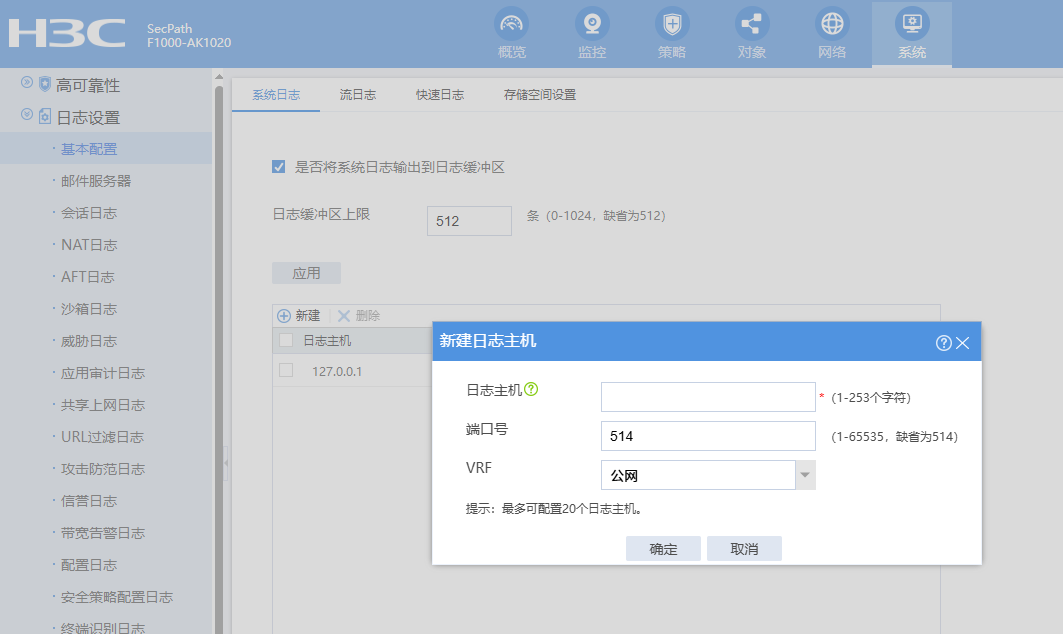 在H3C F1070设备上将会话日志输出到IP地址为192.168.1.100的日志服务器,需配置如下命令: